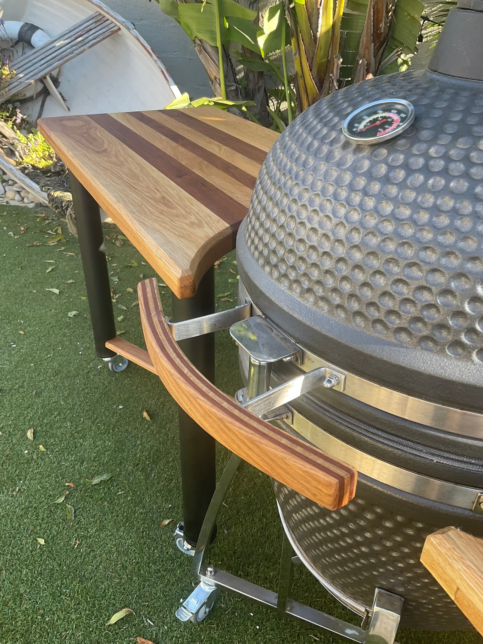 Extra space for outdoor cooking. Our Kamado Club 21" is paired with this locally handcrafted Kamado table & large shelf. It is designed to provide practical space without compromising beauty or style. Made from responsibly sourced Oak & Mahogany hardwoods, ensuring that each piece is unique and visually striking.